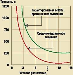 В настоящее время накоплен большой статистический материал, по которому в Euteltracs можно оценить точность определения местонахождения для различных рельефов местности, широтных районов (от 25 до 70б? с.ш.) и значений углов разнесения (3, 6 и 9б?). Координаты контролировались путем сопоставления вычисленных навигационных данных с параметрами, определенными с помощью контрольного GPS-приемника и мелкомасштабной карты. Анализ данных показывает, что основным фактором, влияющим на точность, является угловое разнесение между навигационным и связным КА. Так, если его величина составляет 9б?, то среднеквадратичная погрешность определения координат равна 100 м (см. рисунок).