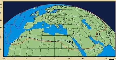 | Зона обслуживания Euteltracs а) Через спутник SESAT b)Через спутник W3 |