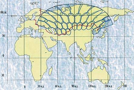 | Зоны обслуживания региональной CПCC «Зеркало-Г1» (точка стояния КА — 90,5? в. д., минимальный угол места — 60) |