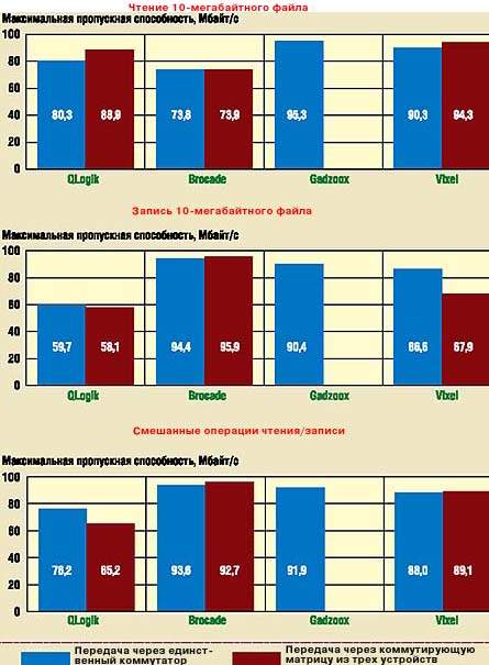 При выполнении серверами операций записи на диск, а также случайной последовательности операций чтения/записи наилучшие усредненные результаты показали коммутаторы SilkWorm. Второе место заняла модель Capellix 2000G, третье — устройства 7200 и 7100 от Vixel, а на последнем оказались коммутаторы SANbox. Надо отметить, что на практике пользователи постоянно сталкиваются с ситуацией одновременного выполнения множества операций чтения/записи.
