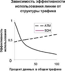 Теперь мы можем оценить влияние структуры реального трафика на пропускную способность сетей. Если в настоящее время около 90% трафика российских SDH-сетей составляют голосовые сигналы, то в развитых странах доля таких сигналов существенно меньше (не более 70%). Ожидается, что в будущем доля числовых данных (используемых при обмене информацией между компьютерами, в IP-телефонии, в видеоприложениях и др.) возрастет и превысит объем «чистого» голосового трафика. Как свидетельствует анализ, проведенный Williams Communication Group, при передаче разнородного трафика возникает следующая зависимость эффективности использования пропускной способности линии от отношения долей голос/данные в общем объеме информации (рис. 2). Понятно, что сеть, в которой применяется временное уплотнение (например, SDH), удовлетворительно работает лишь при ее незначительной загрузке трафиком данных. Такая ситуация обычно складывается в начале эксплуатации линии, когда основной нагрузкой является передача телефонных разговоров. С развитием телекоммуникационной инфраструктуры региона все больший вес приобретает транспортировка данных, и при отсутствии коммутирующего слоя в виде ATM сеть начинает «задыхаться».