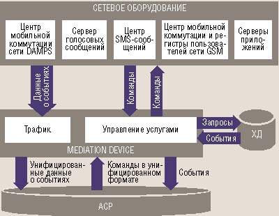 Проиллюстрируем сказанное на примере использования конвергентной АСР в современной сотовой связи. Такие сети поначалу предоставляли только услуги телефонии. Теперь спектр их услуг значительно шире — это роуминг, автоинформирование, голосовая почта, SMS и т. п. В большинстве сетей мобильной связи используется разнородное оборудование, имеющее различные форматы учетных данных, что усложняет предтарификационную обработку информации, поступающей от сетевых устройств. Сбор учетных записей и преобразование их из формата, специфического для оборудования определенных изготовителей, в формат, «понятный» системе расчетов, осуществляют специальные комплексы — Mediation Devices (MD). Поэтому внедрение АСР включает процесс ее сопряжения с сетевыми устройствами.
