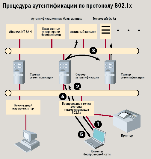 Процедура аутентификации включает в себя следующие стадии: 1. Клиент беспроводной сети отправляет запрос на аутентификацию беспроводной точке доступа либо коммутатору проводной сети, поддерживающему стандарт 802.1x. 2. Беспроводная точка доступа либо коммутатор изменяют формат клиентского запроса для его последующей отправки серверу RADIUS, который должен поддерживать стандарты EAP и 802.1x. 3. Сервер RADIUS проверяет поступивший запрос, после чего переадресует его другому серверу либо непосредственно обращается к аутентификационной базе данных. 4. Если аутентификация клиента прошла успешно, сервер RADIUS информирует об этом беспроводную точку доступа или коммутатор проводной сети. 5. Беспроводная точка доступа или коммутатор проводной сети, поддерживающий стандарт 802.1x, сообщают клиенту, что ему разрешен доступ в сеть. Поскольку синхронизация клиентов не всегда проходит корректно, следует убедиться в своевременной активизации средств поддержки протокола WEP. |