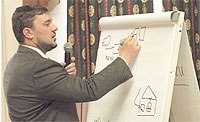 Кроме чисто технических проблем освоения нового диапазона, расширения перечня предоставляемых услуг, а также перспектив выработки единого стандарта IEEE 802.11g, участники конференции много внимания уделяли юридическим вопросам. Главным докладчиком по этой теме без преувеличения можно назвать Александра Стадинчука, представителя компании «НПФ Гейзер», занимающейся консалтингом в области беспроводных сетей.