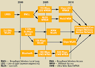 Для локальных беспроводных сетей корейские производители готовят наборы микросхем, поддерживающих IEEE 802.11a, которые поддерживают передачу данных на скорости до 54 Мбит/с в частотном диапазоне 5 ГГц. На форуме говорилось о разработке принципиально новой технологии WLAN, которая подразумевает использование диапазона частот 60 ГГц. Ее спецификации будут готовы в 2003 году. Немалое внимание корейские разработчики уделяют серии стандартов 802.15, описывающих технологию Bluetooth. Кроме того, готовится вариант интеграции технологий, применяемых для создания персональных радиосетей и действующих в диапазоне 2,4 ГГц. По оценкам корейского института электроники и телекоммуникаций, к 2005 году скорость передачи данных по сетям PAN и WLAN достигнет 100 Мбит/с.