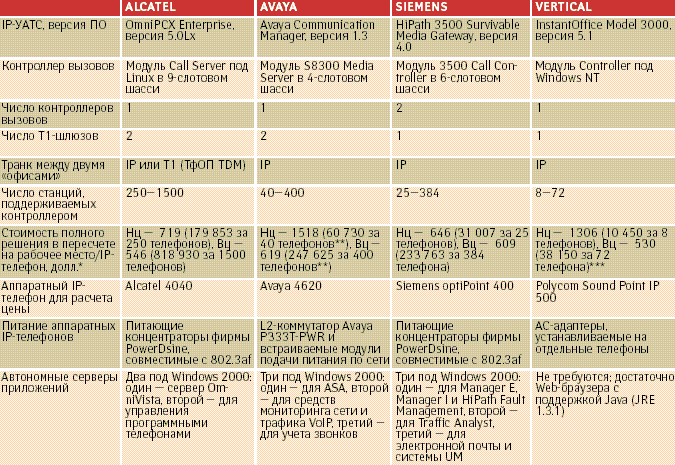 Примечания. * При определении стоимости в пересчете на один аппаратный или программный IP-телефон учитывались фигурировавшие в тестах модель контроллера вызовов, средства поддержки голосовой почты и общего каталога пользователей, транки T1, полный набор управляющих приложений. Аппаратные IP-телефоны относятся к устройствам среднего класса: они имеют дополнительный коммутируемый порт, по крайней мере 10-кнопочную тастатуру и ЖК-дисплей. В общие конфигурации входило равное число аппаратных и программных IP-телефонов (за исключением IP-УАТС Vertical). ** В тестировавшейся конфигурации на одну половину аппаратных IP-телефонов питание подавалось с коммутаторов второго уровня Avaya P333T-PWR, а на другую — через специальные встраиваемые модули. Обе категории устройств совместимы со стандартом IEEE 802.3af. *** Компания Vertical не поддерживает программные телефоны, поэтому при вычислении суммарной стоимости решения они заменялись на аналоговые телефоны по цене 100 долл. каждый, что примерно соответствует уровню цен на ПО программных телефонов. В отличие от остальных систем, продукт Vertical не поддерживает интегрированного пользовательского каталога и способен работать только с одной моделью аппаратного IP-телефона. Пользователи должны приобретать его у компании Polycom. Нц — низшая ценовая категория, Вц — высшая ценовая категория, UM — Unified Messaging (сервис универсальной обработки сообщений). |