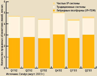 Согласно другому упомянутому исследованию (компании Canalys, опубликованному в августе 2003 года), в регионе EMEA прочно удерживают первую строчку популярности гибридные телефонные системы, которые способны одновременно обслуживать как IP, так и TDM-соединения. За II квартал 2003 года заказчикам поставлено порядка 3 млн абонентских портов, обслуживаемых гибридными системами. Вдвое меньше (около 1,5 млн портов) продано традиционных платформ с коммутацией каналов (УПАТС). Доля «чистых» VoIP-решений в общем объеме продаж пока невелика (177 тыс. абонентских линий), причем тенденция к ее увеличению не столь заметна, чтобы говорить о возможности доминирования такого рода систем в ближайшее время.