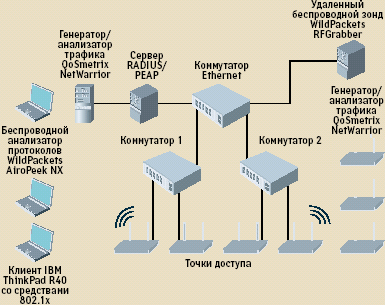 Отдельные испытания были посвящены роумингу пользователей и аутентификации в соответствии со стандартом 802.1x. В этом случае в роли клиентских устройств выступали ноутбуки ThinkPad R40 компании IBM, а в роли сервера PEAP — Internet Authentication Server, поставляемый вместе с операционной системой Windows 2000 Advanced Server корпорации Microsoft. Для проверки параметров аутентификации, которыми клиентское устройство обменивалось с сервером, а также для выявления нештатных ситуаций в сети использовались анализатор протоколов для беспроводных сетей AiroPeek NX и удаленный беспроводной зонд RFGrabber производства фирмы WildPackets.