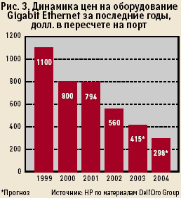 Обеспечение гигабитных скоростей передачи трафика вплоть до границы сети (GTTE) соответствует общей тенденции увеличения полосы пропускания на всех участках инфраструктуры. Помимо роста интенсивности трафика, появления новых сервисов и приложений целесообразность перехода на гигабитный вариант Ethernet не в последнюю очередь продиктована продолжающимся падением цен на соответствующее оборудование. Кроме того, крупнейшие поставщики компьютерной техники все чаще снабжают свои продукты встроенными интерфейсами GE. Фирма HP не стала исключением: с июля 2003 года все выпускаемые ею серверы, настольные компьютеры и ноутбуки поставляются с 10/100/1000-Мбит/с интерфейсом Ethernet. В этой связи появление новых гигабитных модулей и компактных коммутаторов с высокой плотностью гигабитных портов кажется вполне логичным.