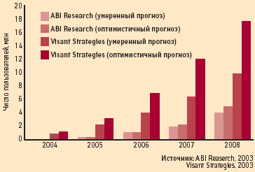 Вот еще несколько цифр. Эксперты компании ABI оптимистично полагают, что инфраструктурное оборудование WiMAX начнет поставляться уже в нынешнем году. Базовые станции с радиусом действия до 48 км будут стоить в среднем 30 тыс. долл. Вслед за ними, ориентировочно в начале 2005 года, на рынке появится абонентское оборудование, которое будет предлагаться конечным пользователям за 400—500 долл.