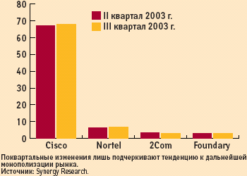 Особенно четко фактор монополизма проявляется в российской провинции, где большинство предприятий заняты построением, расширением либо модернизацией инфраструктурной основы корпоративной информационной среды, то есть закупками маршрутизаторов и коммутаторов Ethernet. Приложения, нацеленные на оптимизацию уже выстроенных бизнес-процессов (такие как беспроводный доступ, IP-телефония и call-центры), там часто считают неоправданной роскошью, поскольку во многих местах компьютеры не подключены к серверам, а офисы не имеют полноценного (выделенного) выхода в Internet. Получается, что в регионах рано говорить о серьезной конкуренции производителей сетевого оборудования в разных технологических областях, ибо реально востребованными там остаются лишь инфраструктурные элементы сети.