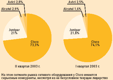 Российский партнер Gartner — исследовательская компания Market-Visio предоставила предварительные данные Gartner Dataquest за 2003 год (см. www.marketvisio.ru) относительно доли рынка, занимаемой Cisco в регионе EMEA. В отчете указывается, что Cisco Systems продолжает занимать доминирующее положение во всех сегментах маршрутизаторов для корпоративного применения. Несмотря на экономический спад, лидер увеличил отрыв от конкурентов, в то время как другие поставщики лишь сохранили или даже уступили свои позиции. В денежном выражении доля Cisco увеличилась за прошлый год на 1,1% и составила 90,9% всех поступлений в этом сегменте оборудования. В целом по региону EMEA емкость этого рынка оценивается в 1494,2 млн долл.