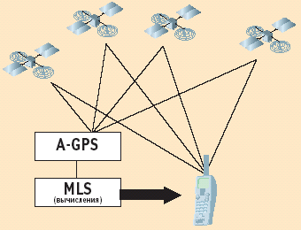 | Рис. 3. Комбинированный метод местоопределения с помощью телефона, оснащенного модулем GPS |