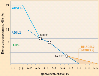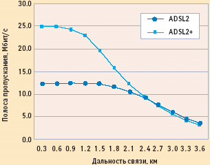 Скорость и дальность передачи. Семейство стандартов ADSL2 разрабатывалось прежде всего ради увеличения скорости передачи на протяженных соединениях, которые традиционно характеризуются низким отношением сигнал/шум (Signal-to-Noise Ratio, SNR). Если теоретический максимум пропускной способности для нисходящего трафика на линиях ADSL2 составляет примерно 8 Мбит/с, то следование стандарту ADSL2 позволяет поднять его до 12 Мбит/с.