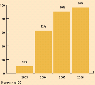Что касается конвергенции, главными показателями могут служить превышение объемов трафика данных над голосовым, более высокие темпы роста трафика данных (примерно на 56% ежегодно в течение ближайших трех лет), а также изменение в нынешнем году пропорций при продажах сотовых телефонов в пользу аппаратов с поддержкой передачи данных. Победное шествие цифровых технологий проявляется в стремительном росте как объема корпоративных данных, накопленных внутри любой организации, так и информации, доступной пользователям Всемирной паутины. В отношении перспектив роста абонентской базы Intel сделала свою позицию чуть более реалистичной: если в феврале к 1 млрд сетевых пользователей компания планировала добавить еще 5 млрд, т. е., по сути дела, всех жителей планеты, то теперь речь идет уже о 3 млрд. Правда, конкретные сроки приобщения этих людей к современным достижениям компьютерных и телекоммуникационных технологий остаются неопределенными.