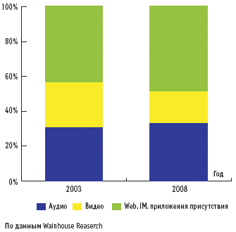 Итоговые прогнозы WR по объемам мирового рынка инфраструктурного оборудования класса Сollaborative Communications предсказывают среднегодовой рост на уровне 12,6% с 2003 по 2006 год. Суммарная выручка вендоров инфраструктурного оборудования для конференц-связи и средств совместной работы увеличится с 475 до 675 млн долл., невзирая на драматическое падение отпускных цен. Затем начнется период замедления роста и даже стагнации рынка (рис. 1). Ожидается, что за тот же период (с 2003 по 2008 год) доля систем для организации Web-конференций, приложений присутствия и IM а также систем аудиоконференц-связи в общей структуре продаж вырастет в ущерб инфраструктурному оборудованию для ВКС, включая MCU, видеошлюзы и контроллеры доменов (рис. 2).