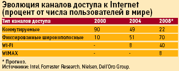 Судя по всему, эта перспектива станет реальностью уже в ближайшие год-два. Согласно прогнозам Intel, появление на рынке первых микросхем, реализующих стандарт WiMAX, уже в будущем году станет мощным стимулом к производству законченных устройств множеством компаний. В 2006 году ожидается активное внедрение средств поддержки WiMAX в ноутбуках, а еще через год — в карманных ПК. В 2008 году почти половина пользователей для выхода в Internet будет использовать беспроводные технологии (см. таблицу).