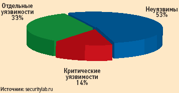 Причина несерьезного отношения малых предприятий к проблеме ИБ кроется в том, что многие компании даже не подозревают, насколько уязвимы их ИС. Исследования специалистов компании Positive Technologies (владельца портала securitylab.ru), предоставляющей услуги оценки уязвимости ИС для предприятий разного масштаба, дали любопытные результаты. Так, среди российских фирм, решившихся на экспертизу своих СИБ, 53% оказались практически неуязвимыми, 33% имеют «дыры» в защите, а 14% — и вовсе обладают целым «букетом» критических уязвимостей, любая атака в отношении которых приведет к серьезным нарушениям работы организации (рис. 1).