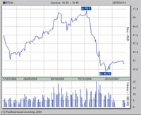 Во-вторых, не исключено, что реальная утечка сведений о намерении МГТС заняться предоставлением услуг дальней связи произошла примерно за месяц до описанных событий, ведь на покупку, инсталляцию и испытания VoIP-систем потребовалось некоторое время. Значит, о предстоящем событии могли знать немало сотрудников компании. Взглянув на график изменения биржевых котировок акций «Ростелекома» на РТС и ММВБ за последние два месяца, мы увидим, что в сентябре-октябре стоимость акций последовательно росла, хотя аналитики и продолжали «пережевывать» тему грядущих либеральных реформ в отрасли связи. Рост котировок продолжался вплоть до середины ноября, когда стоимость акции «Ростелекома» достигла шестимесячного максимума (на уровне 70,7 руб.). Однако затем произошел ничем не мотивированный обвал цен, и к моменту публикации злополучной статьи в «Ведомостях» акции «Ростелекома» подешевели более чем на треть (до 48,9 руб. за штуку).
