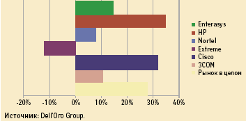 Достаточно вспомнить, что еще шесть лет назад фирма занимала 11-е место в рейтинге производителей Ethernet-коммутаторов. Сегодня ей принадлежит вторая позиция, а в планах HP — потеснить безусловного лидера этого рынка Cisco Systems и выйти на рынок оборудования операторского класса для магистральных сетей. Согласно данным Dell?Oro Group, в весьма динамичном IV квартале 2004 года бизнес PNB рос быстрее, чем рынок в целом и бизнес основных конкурентов компании (см. рисунок). Симптоматично и то, что в своем последнем отчете о рынке оборудования для кампусных сетей (декабрь 2004 года) фирма Gartner впервые поместила HP в категорию претендентов на лидерство — выше 3Com, Alcatel, Enterasys, Extreme и Nortel. Пальма первенства в очередной раз досталась Cisco.