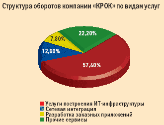 По оценкам аналитиков IDC, наибольших успехов в области ИТ-услуг добилась фирма «КРОК». Ее доля в российском секторе ИТ-услуг составила в 2004 году 3,7% (против 3,4% в 2003 г.). По сведениям самого «КРОКа», его доход от сервисной деятельности достиг 75,9 млн долл., причем 57,4% этой суммы пришлись на услуги построения ИТ-инфраструктуры, 12,6% — на сетевую интеграцию, 7,8% — на разработку заказных приложений, 22,2% — на прочие сервисы. Если учесть, что объем доходов компании за 2004 год составил 236,9 млн долл. (по данным Cnews), то станет понятно: оказание услуг сформировало около трети ее совокупной выручки.