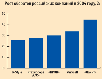 С усилением процессов консолидации стали стираться четкие грани между «игровыми полями» основных участников ИТ-рынка. Сегодня каждый стремится любыми средствами оставаться на плаву, расширяя свой бизнес или меняя стратегию развития. В 2004 году на почетные первые места в рейтингах независимых аналитиков вышли группы компаний с распределенной структурой и многопрофильным бизнесом. В сферу деятельности организаций, занимающих строчки со второй по седьмую в рейтинге агентства CNews (а это — «Национальная Компьютерная Корпорация», IBS, R-Style, «Техносерв А/С», «ЛАНИТ» и Verysell), входят дистрибуция, системная интеграция, консалтинговые услуги, высокотехнологичные сервисы и разработка собственных продуктов. По оценке IDC, в 2004 году объем российского ИТ-сектора экономики увеличился на 26,3%, и получается, что обороты этих холдингов росли либо наравне с рынком, либо с опережением (R-Style — 25,8%, «Техносерв А/С» — 27,6%, Verysell — 33,6%, «ЛАНИТ» — 44,5%).