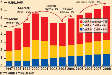 Ряд аналитических агентств рассматривают рынок ИБП как самостоятельный сегмент игрового поля. По данным Frost&Sullivan, в 2004 году мировой объем рынка ИБП составил 6 млрд долл., из которых 3,33 млрд долл. приходятся на системы мощностью до 10 кВА, а 1,45 млрд долл. — на продукты тяжелого класса мощностью более 10 кВА. Объем сервисных услуг, утверждает Frost&Sullivan, составил в прошлом году 1,23 млрд долл. По прогнозам того же агентства, к 2008 году суммарный объем поставок ИБП и сопутствующих услуг увеличится на 25%, достигнув 7,6 млрд долл. При этом наиболее динамичное развитие рынка ожидается в двух секторах — однофазных источников бесперебойного питания (ориентированных преимущественно на рынок SOHO) и технического сервиса.