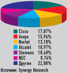 В целом мировой рынок оборудования для корпоративной телефонии в III квартале 2005 года увеличился всего на 2% (по сравнению с аналогичным периодом прошлого года), достигнув отметки 2,24 млрд долл. Спрос на системы, полностью основанные на IP, вырос на 31%, тогда как спрос на традиционные TDM-решения снизился на 20%. На протяжении III квартала прошедшего года динамика продаж в сегменте «чистых» VoIP-систем опережала поставки в сегменте гибридных систем телефонии (15 против 14%), в результате чего Avaya уступила лидерство своему главному конкуренту, Cisco Systems. Впрочем, ссылаясь на сезонность колебаний спроса, аналитики не исключают возвращения Avaya на вершину рыночного пьедестала по итогам IV квартала.