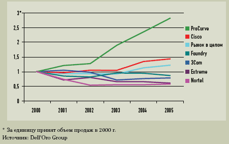 | Как показано на графике, в 2005 году помимо HP ProCurve Networking только Cisco Systems удалось поставить продукции больше, чем в 2000-ом году. У остальных конкурентов ProCurve продажи коммутаторов составляют от 60 до 80% оборота, зафиксированного пять лет назад. |
