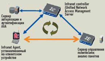 Решение действует по уже описанной схеме. Данные о соответствии требованиям политики безопасности, собираемые ПО Infranet Agent с клиентских устройств перед их подключением к сети, передаются на контроллер IC 4000 (рассчитан на поддержку 3 тыс. пользовательских узлов) или IC 6000 (до 25 тыс. машин) и обрабатываются сервером. Если проверка прошла успешно, на межсетевой экран Netscreen подается команда активизировать доступ к ресурсам. При обнаружении проблем машина перенаправляется на специальный сетевой ресурс для их устранения. По мнению Ковалева, ключевыми преимуществами данного решения являются обеспечение всесторонней проверки безопасности хоста, поддержка всех способов подключения к сети и возможность совместной работы с оборудованием других производителей. Правда, использование Enterprise Infranet не исключает атак типа host-to-host.