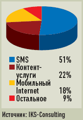 В динамичном развитии данного сегмента услуг заинтересовано большинство проводных и сотовых операторов, контент-провайдеров и поставщиков специализированных решений. В условиях замедления темпов роста абонентской базы мобильных сетей и сокращения доходов от голосовых услуг в фиксированных сетях операторы надеются заинтересовать подписчиков новыми сервисами. Но по-прежнему «первой скрипкой» в дополнительных услугах операторов мобильной связи остается передача SMS-сообщений, на которую пришелся 51% доходов. Еще 22% принесли контент-услуги, 18% — мобильный Internet и 9% — остальные сервисы.