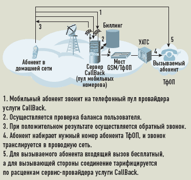 Пользователь набирает номер пула оператора, слышит два коротких гудка и нажимает клавишу «отбой». На стороне оператора компьютер проверяет баланс пользователя, закрепленного за определившимся номером, и, при его положительном значении, осуществляет обратный звонок. Далее абонент набирает требуемый номер городской сети, и голосовой трафик транслируется через мост GSM/ТфОП. О принципах функционирования межсетевых мостов корпоративного уровня мы рассказывали в статье «По невидимым мостам» (№18 за 2005 год). Решения, установленные у сервис-провайдеров, по сути, отличаются лишь более высокой пропускной способностью.