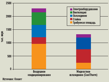 По данным APC, резервирование систем электропитания и охлаждения позволяет сокращать время простоев с 22 до 1,2 ч в год, но такой вариант обходится в 1,5 раза дороже обычной архитектуры. Одна из тенденций — создание модульных, гибких, масштабируемых систем охлаждения и электропитания. По данным Knuerr, жидкостное охлаждение может оказаться на 40% экономичнее воздушного. Оно повышает энергоэффективность ЦОД до 30% и дает возможность сэкономить до 80% рабочих площадей. Для отвода более 5 кВт тепла на стойку обычно применяют жидкостные системы. Система CoolTherm производства Knuerr с разделением контуров водяного и воздушного охлаждения позволяет отводить до 35 кВт тепловой энергии от стойки с модульными серверами.