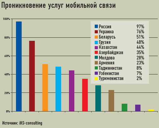 Как следует из отчета iKS-consulting, число абонентов сотовой связи в СНГ (включая Россию) с начала 2006 года выросло на 21% и достигло 197,6 млн. Наименьший процент проникновения мобильных технологий зафиксирован в Туркменистане (2%), Узбекистане (7%) и Таджикистане (8%). В Армении этот показатель составляет 23%, в Молдове — 28%, в Азербайджане — 35%. Лидером рейтинга развитости рынка (после России) является Украина — 35,9 млн абонентов (76% по уровню проникновения). Стремительными темпами «мобилизуются» Белоруссия (51%), Грузия (48%) и Казахстан (44%), а значит, рынки этих государств наиболее привлекательны для внешних инвестиций.