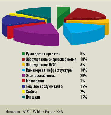 Поставщики специализированного оборудования для ЦОД на основе собственного опыта определяют стоимостные аспекты владения дата-центрами. Компания APC приводит весьма любопытную оценку стоимости владения ЦОД в течение всего жизненного цикла объекта, который составляет примерно 10 лет. Оказывается, небольшой ЦОД четвертого класса с энергопотреблением 100 кBт и средней энергонагрузкой 1,5 кBт на стойку обойдется в 120 тыс. долл. на каждую стойку. В эту сумму включены и расходы на телекоммуникационную составляющую, которая обеспечивает высокую доступность на четвертом уровне отказоустойчивости. На основе этих ориентировочных сведений фирмы могут определить период возврата инвестиций и наметить мероприятия по снижению затрат на организацию и содержание ЦОД.