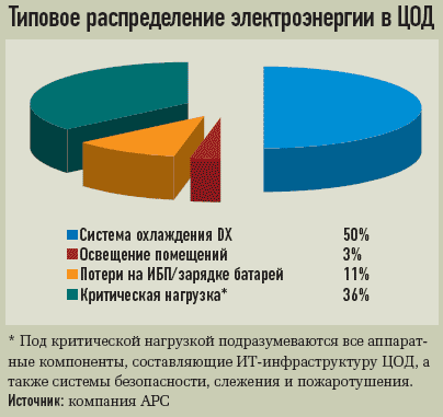- системы кондиционирования и вентиляции требуют в среднем 90-100% мощности, потребляемой серверным и телекоммуникационным оборудованием ЦОД.