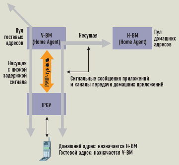 Следующий крупный раздел посвящен мобильности и роумингу. Рассматриваемые в нем аспекты особенно актуальны с точки зрения универсальности предложенной архитектуры (их применимости для разных сетей доступа), а также возможности «гладкого» перехода абонента из одной сети в другую. Описываются сценарии роуминга и взаимодействие элементов архитектуры A-IMS, отвечающих за непрерывность оказания услуг при перемещении абонентов. В предложенных решениях широко используется модель, в рамках которой клиент (АТ) получает два IP-адреса: один — в «домашней» сети, а другой — в «гостевой» (рис. 2).