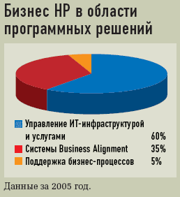 Вообще говоря, программные продукты нельзя назвать профильным бизнесом корпорации. Ее оборот в прошлом году распределился следующим образом: персональные компьютеры и рабочие станции — 32%, принтеры и многофункциональные устройства — 28%, системы хранения данных — 19%, сервисы — 18%, финансовые услуги — 2%, Software — 1%. Бизнес HP в области программных решений тоже поделен на несколько сегментов: программное обеспечение для оптимизации инфраструктуры и услуг — 60%, приложения для согласования развития бизнеса и ИТ-стратегии (Business Alignment) — 35%, системы поддержки бизнес-процессов (Business Process Improvement) — 5%.