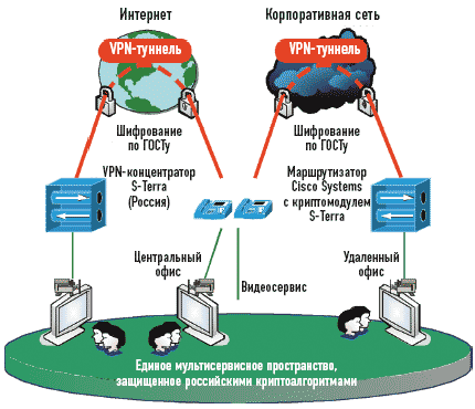 Теперь такие решения начали появляться. Продукты на базе шлюзов безопасности CSP VPN отечественной компании «С-Терра СиЭсПи» созданы на базе международных стандартов IKE/IPSec (RFC 2401-2412) и совместимы на уровне механизмов управления с аналогичной линейкой Cisco Systems. Шлюзы «С-Терра СиЭсПи» используют алгоритмы шифрования, хеширования и электронной цифровой подписи, которые основаны на российских стандартах (ГОСТ 28147-89, ГОСТ Р34.10-94, ГОСТ Р34.11-94, ГОСТ Р34.10-2001) и реализуются встроенными криптобиблиотеками, сертифицированными ФСБ РФ.