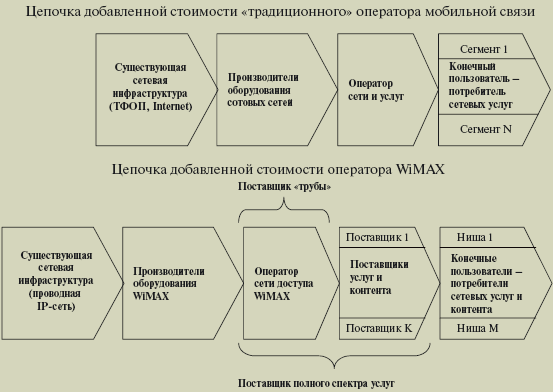 Это ведет к преобразованию цепочки формирования добавленной стоимости. По сравнению с цепочкой, характерной для рынка традиционной сотовой связи, в ней появляются новые звенья. В результате, с одной стороны, «распыляется» процесс создания ценности для пользователя, а с другой, обеспечиваются большая гибкость и благоприятные условия партнерства оператора с поставщиками контента и услуг. Открытость системы позволяет создавать кастомизированные услуги и контент, в силу чего рынок потребителей WiMAX-услуг делится уже не на сегменты, а на большое количество узких сервисных ниш (M>N).