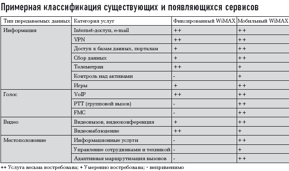 Тем не менее имеет смысл указать самые очевидные приложения и оценить возможность их реализации в сетях на базе мобильного и фиксированного WiMAX. Пресловутые «три кита», на которых держится мир современных коммуникаций, — это передача данных, голоса и видео. Существенным «довеском», с помощью которого можно запустить беспроводные сервисы с высокой добавленной стоимостью, является механизм определения местоположения мобильных пользователей. Именно по этим критериям мы постарались классифицировать существующие и возникающие сервисы в сетях WiMAX.