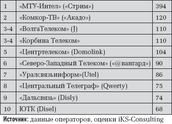 Добавим, что в прошлом году в столице проявляли значительную активность еще два крупных провайдера услуг ШПД — «Центральный Телеграф» (торговая марка QWERTY) и «Комкор-ТВ» (сеть «Акадо»). Первый преуспел в строительстве сети по схеме FTTB почти в 40 жилых районах Москвы и Подмосковья. За прошедший год охват сети «Центрального Телеграфа» вырос в два раза и теперь составляет более 1 млн столичных квартир. Услугами широкополосного доступа на базе сети QWERTY пользуются свыше 75 тыс. абонентов. А число клиентов сети «Акадо», развивающей в сетях кабельного телевидения услуги ШПД по технологии HFC, составило к концу года примерно 120 тыс.