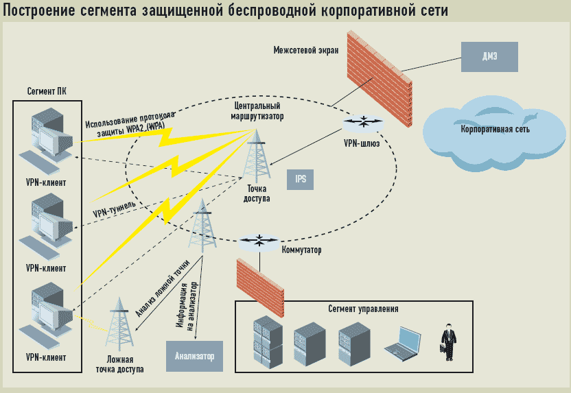 Защитите вашу проводную сеть от беспроводного сегмента. Для этого могут пригодиться межсетевые экраны и системы предотвращения вторжений, устанавливаемые на границе сред, технология VLAN (для разделения потоков между разными типами сетей), установка на мобильных устройствах персональных межсетевых экранов, антивирусов и т.д. Соответствие настроек мобильных устройств глобальной политике безопасности, принятой в организации, может проверяться при помощи специальных комплексов от Symantec, Cisco, CA и др.