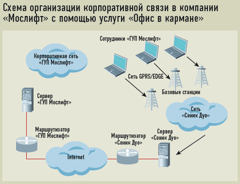 Первая из них пригодится компаниям, сотрудники которых большую часть времени проводят вне стен предприятия. «Офис в кармане» предоставляет им возможность защищенного доступа к корпоративной сети передачи данных при помощи мобильных устройств — смартфонов, КПК и ноутбуков. С помощью этой услуги можно получать доступ к корпоративной электронной почте и календарю встреч, пользоваться общими файлами, базами данных и приложениями, просматривать внутренний сайт предприятия, выходить в Internet. Важной особенностью услуги является то, что она предоставляется как в домашней сети, так и в режиме роуминга.