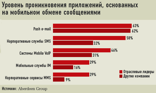Аналитики Aberdeen выделили пять групп решений, основанных на мобильной передаче сообщений: электронная почта с автоматической доставкой писем (Push e-mail), мгновенный обмен сообщениями с контролем над присутствием (Mobile IM), корпоративные сервисы SMS и аналогичные услуги MMS, голосовые системы Mobile VoIP. На момент опроса первая группа решений оказалась самой востребованной. Сервисы Push e-mail внедрили 63% лидеров индустрии и 62% других респондентов. Далее следовали (в порядке убывания популярности для обеих групп) сервисы Enterprise SMS, Mobile VoIP, Mobile IM и Enterprise MMS. Системы мобильной передачи голоса по IP в ближайшее время собирались внедрить наибольшее число компаний (26%), а в пользу внедрения корпоративной службы MMS высказалась наименьшая доля опрошенных (7%).