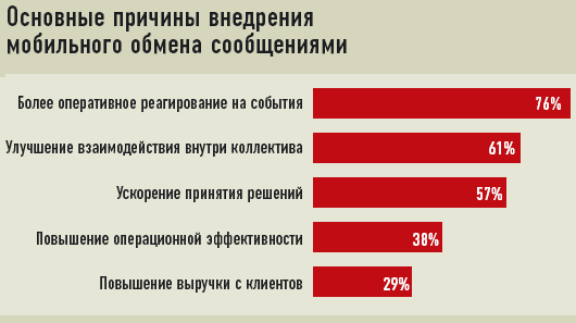 Исследовательская группа Aberdeen в ноябре-декабре прошлого года обобщила результаты опроса более 150 предприятий — преимущественно из Северной Америки и Европы. Опрос был посвящен причинам внедрения приложений, основанных на мобильном обмене сообщениями, а также ожиданиям от таких проектов и проблемам использования мобильных коммуникаций.