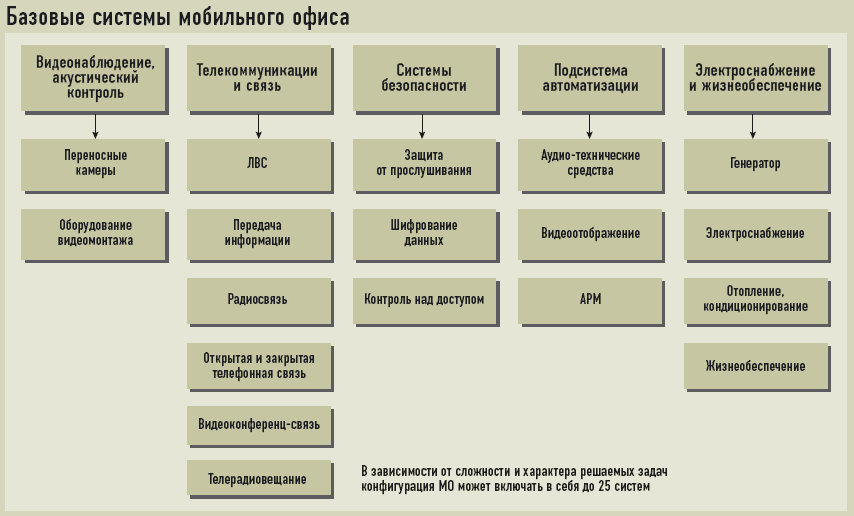 Отметим, что с учетом возросших требований к перечню услуг, доступных в мобильном офисе, и к обеспечению автономного пребывания в нем большого коллектива (часто — в экстремальных условиях) размещение многочисленных устройств на борту автобусов оказалось нетривиальной задачей. Поэтому в создании таких решений участвуют команды специалистов самых разных профилей — инженеров, дизайнеров и даже краснодеревщиков. А для решения задачи воздушной транспортировки подобных офисов привлекаются специалисты из авиационной промышленности. В результате получаются не только многофункциональные, но и очень мобильные системы, которые за короткое время можно «перебросить» в любую требуемую точку.