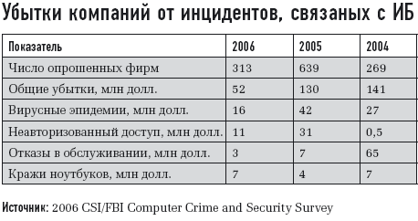 Мамыкин привел выдержки из отчета 2006 CSI/FBI Computer Crime and Security Survey, согласно которым компании всего мира несут максимальные финансовые потери от вирусных атак. Впервые самым популярным средством защиты стали межсетевые экраны (98%). Антивирусные средства использовались в 97% случаев, антишпионские средства — в 79%. Несмотря на разговоры об аутсорсинге систем ИБ, почти никто его не практикует. Почти 87% компаний прибегают к аудиту в области ИБ. На решение проблем ИБ расходуются в среднем 5% корпоративных ИТ-бюджетов.