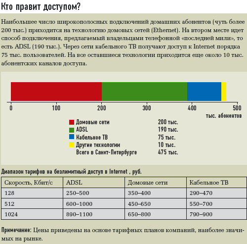 По словам Олега Лебедева, технического директора компании Matrix Network Solutions, сеть которой в начале года занимала среди петербургских домовых сетей второе место, сейчас наиболее острая борьба идет между ADSL- и Ethernet-технологиями. Лебедев уверен, что в долгосрочной перспективе победа будет за Ethernet, которую предпочитают провайдеры домовых сетей. «Количество домохозяйств, подключенных к Internet по каналам Ethernet, уже больше числа домашних ADSL-абонентов», — утверждает он. С учетом информации, полученной из других источников, его оценки кажутся вполне реалистичными.