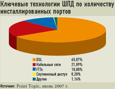 Технологии xDSL остались главным локомотивом индустрии ШПД: их задействуют 66% всех подключенных к Internet пользователей (свыше 200 млн линий). К концу II квартала 2007 года Западная Европа продолжала удерживать лидерство по числу инсталлированных линий DSL (86,5 млн). Однако находящаяся на втором месте по абсолютным показателям Северная Америка (71,6 млн) обогнала европейцев по уровню проникновения этой технологии в частные домовладения (56,4 против 52,2%). Восточноевропейский рынок DSL-доступа, к которому относится и Россия, пока довольно скромен (13,1 млн линий), но ежегодно увеличивается на 60%. Общемировая статистика применения технологий ШПД довольно сильно расходится с российскими реалиями, ведь у нас больше половины всех абонентов, получающих высокоскоростной доступ, подключены к домовым сетям Ethernet.